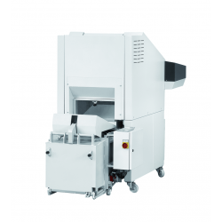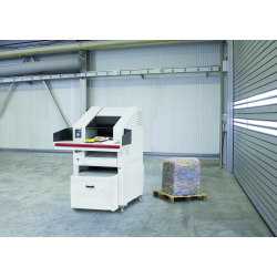 Niezwykle wydajna niszczarka dokumentów z podajnikiem taśmowym w połączeniu z prasą belującą (FA 500.3 i KP 80). Pobór materiału do zniszczenia z obszernego blatu podawczego za pośrednictwem elektrycznie napędzanego podajnika taśmowego. Wielofunkcyjna klawiatura sterująca z funkcją pracy ciągłej i cofania, a także funkcją automatycznego cofania w przypadku wykrycia zacięcia papieru. Zintegrowana, automatyczna olejarka zespołu tnącego. Awaryjna szyna zatrzymująca z przodu blatu podawczego zwiększająca bezpieczeństwo użytkownika. Fotokomórka pozwalająca automatycznie sterować procesem zgniatania. Jednoczesne niszczenie i zgniatanie. Belownica z otworem podawczym/klapą rewizyjną na dokumenty niewymagające niszczenia i kartony. Materiał jest zgniatany bezpośrednio w worku odbiorczym.